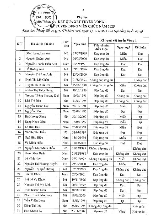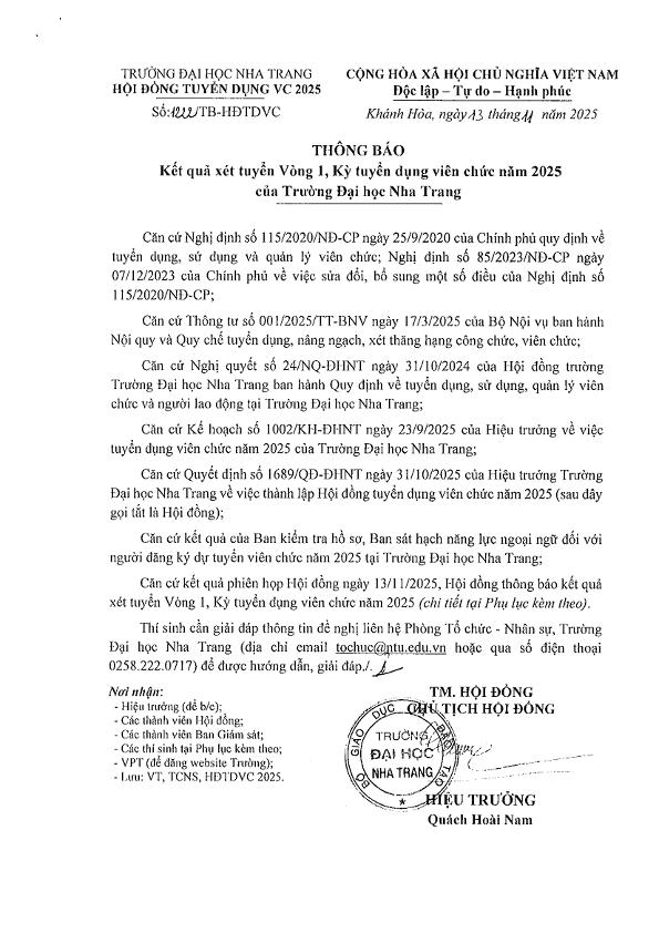 Thông báo kết quả xét tuyển Vòng 1, Kỳ tuyển dụng viên chức năm 2025 của Trường Đại học Nha Trang
