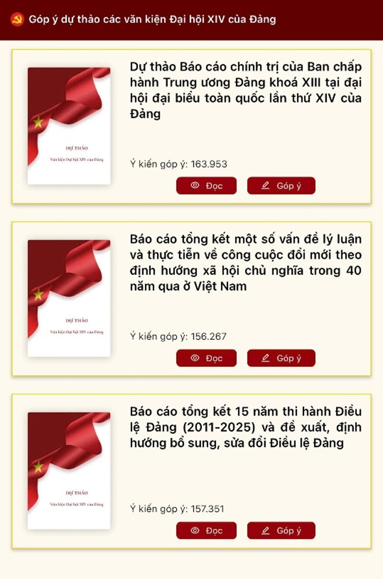 Nội dung lấy ý kiến tập trung vào ba văn kiện chính: Dự thảo Báo cáo chính trị của Ban Chấp hành Trung ương Đảng khóa XIII trình Đại hội XIV; Báo cáo tổng kết một số vấn đề lý luận và thực tiễn về công cuộc đổi mới theo định hướng xã hội chủ nghĩa trong 40 năm; Báo cáo tổng kết 15 năm thi hành Điều lệ Đảng (2011-2025) cùng đề xuất sửa đổi, bổ sung.