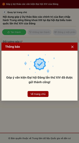 Bước 4: Màn hình hiển thị thông báo gửi góp ý về dự thảo các văn kiện Đại hội Đảng thành công