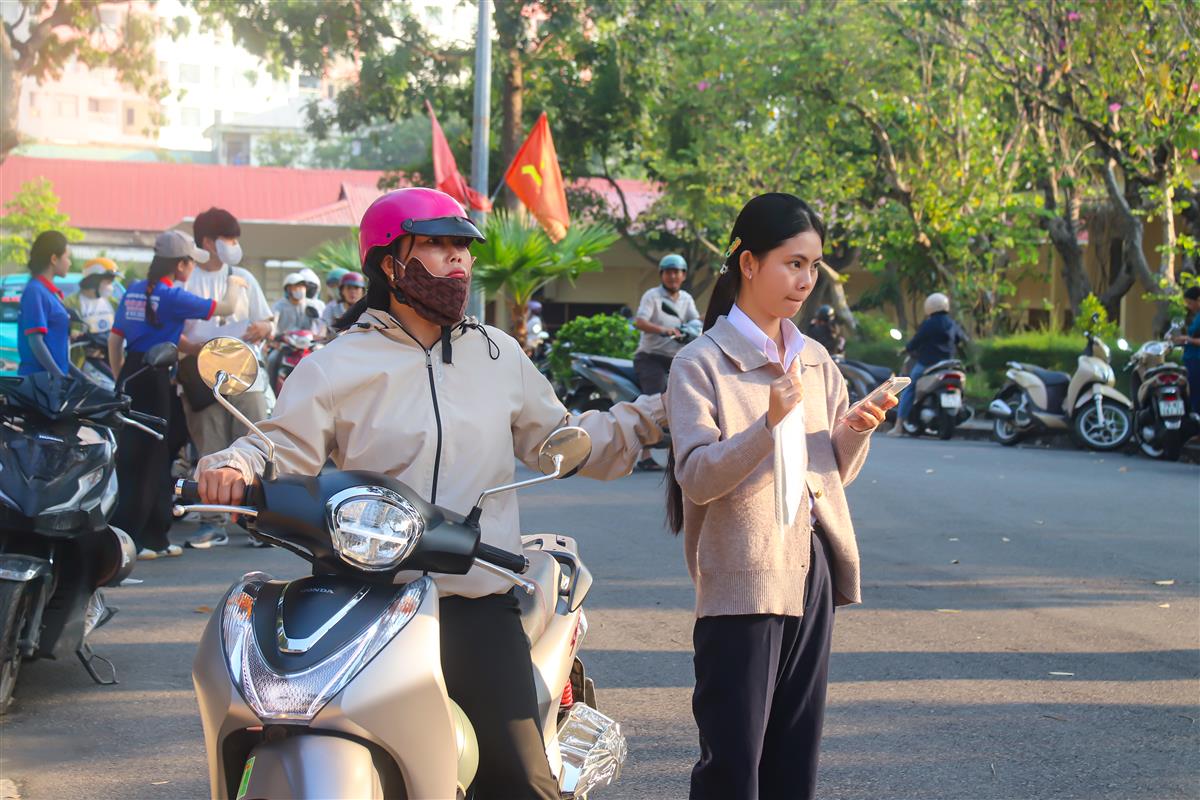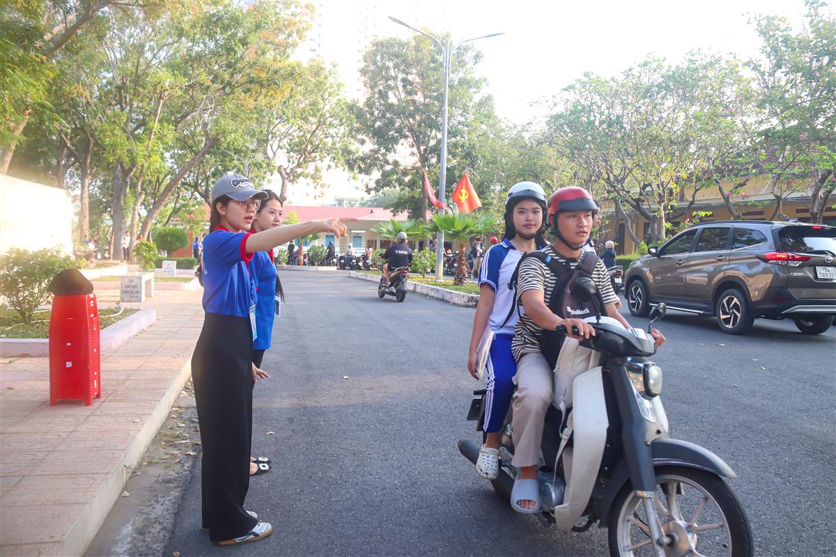 Sinh viên tình nguyện hỗ trợ thí sinh tại cụm thi, góp phần tạo môi trường thi thân thiện, thuận lợi.