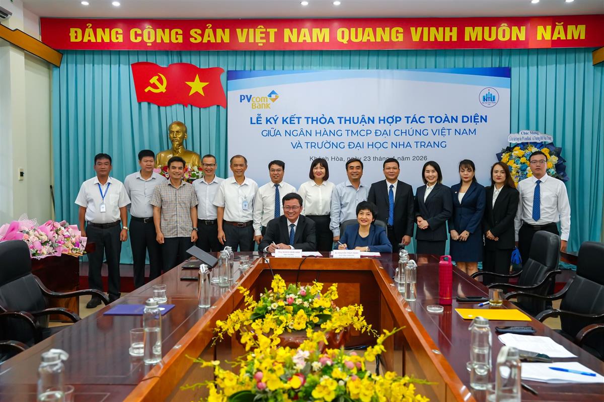 Ngày 23/4/2026, Trường Đại học Nha Trang tổ chức Lễ ký kết Thỏa thuận hợp tác toàn diện với Ngân hàng TMCP Đại Chúng Việt Nam (PVcomBank), đánh dấu bước phát triển mới trong mối quan hệ hợp tác giữa nhà trường và doanh nghiệp trong lĩnh vực tài chính – ngân hàng.