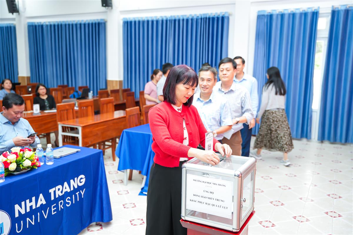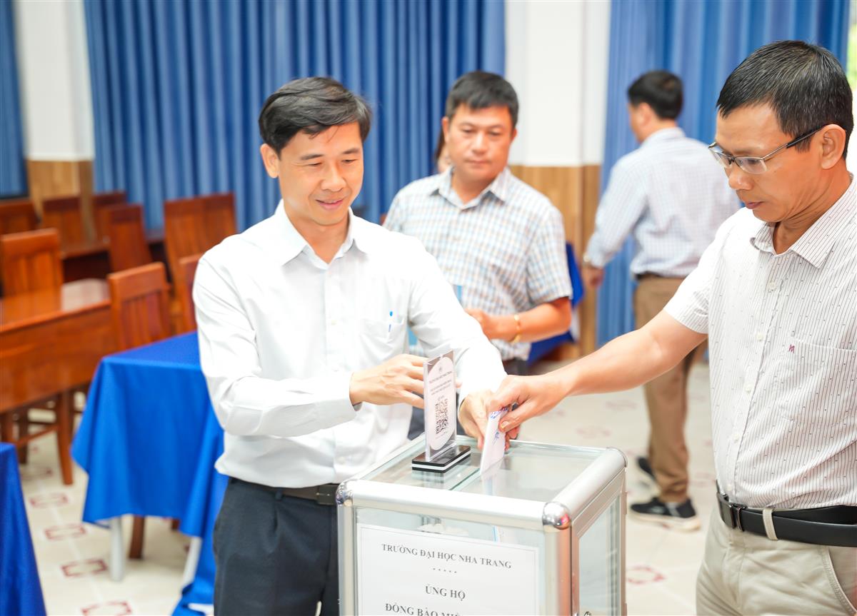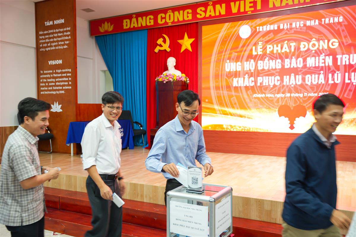 Ngày 28/11/2025, Trường Đại học Nha Trang đã tổ chức Lễ phát động ủng hộ đồng bào miền Trung khắc phục hậu quả lũ lụt, nhằm chia sẻ khó khăn và tiếp thêm nguồn lực cho người dân các tỉnh đang bị ảnh hưởng nặng nề bởi đợt thiên tai vừa qua. Tham dự có TS. Quách Hoài Nam – Hiệu trưởng Nhà trường; GS.TS. Phạm Quốc Hùng và TS. Trần Doãn Hùng – Phó Hiệu trưởng Nhà trường, cùng đại diện lãnh đạo các đơn vị trong toàn Trường.