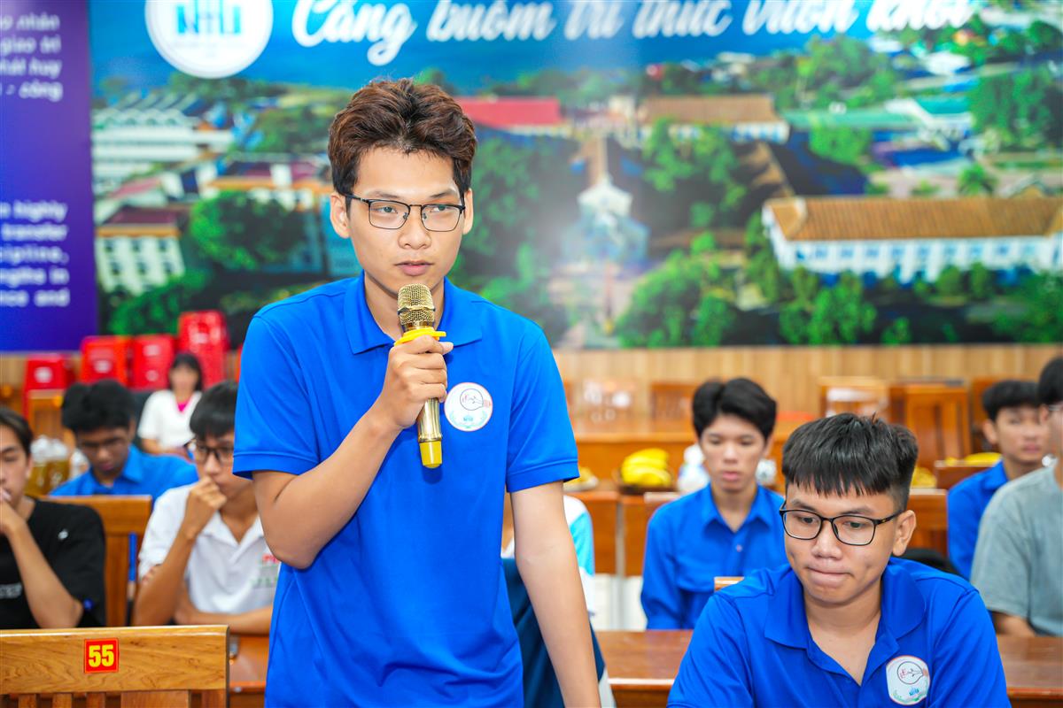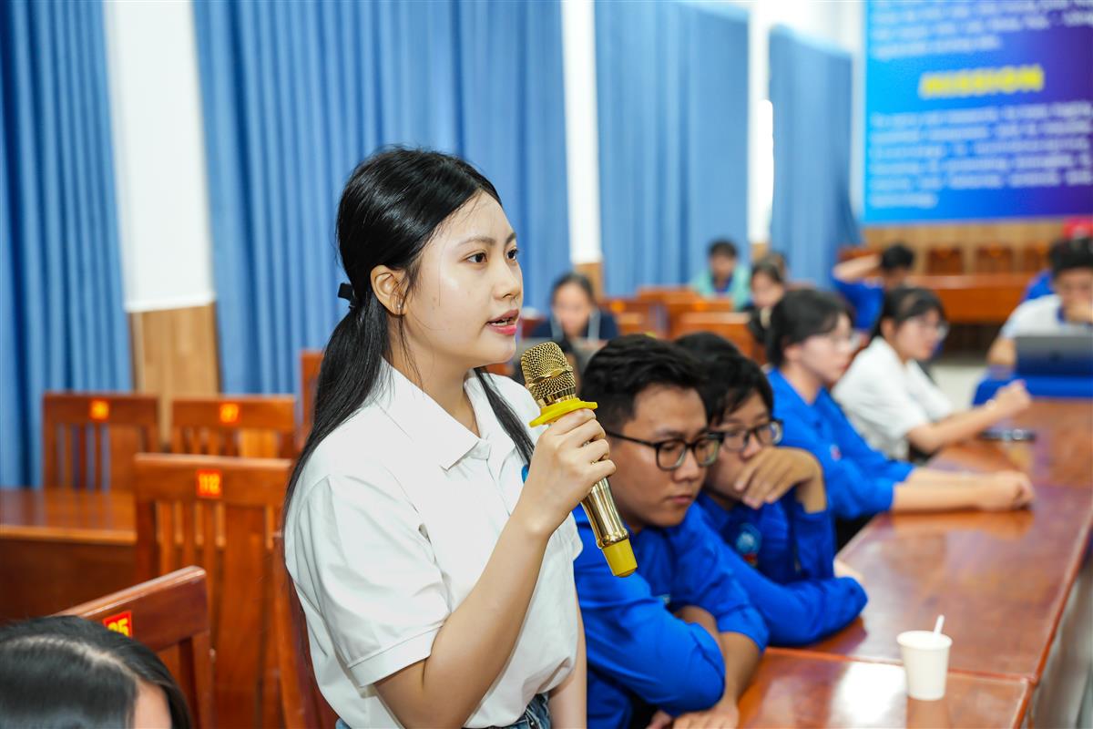 Sinh viên Trường Đại học Nha Trang đặt câu hỏi và được đại diện Nhà trường cùng các cơ quan chức năng trực tiếp giải đáp tại buổi tọa đàm.