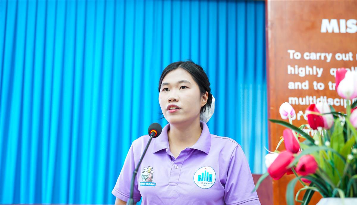 Đại diện sinh viên nhận học bổng phát biểu cảm nghĩ, bày tỏ lời tri ân đến Công ty TNHH Điện lực Vân Phong và Nhà trường vì đã luôn đồng hành, hỗ trợ để các em có thêm động lực phấn đấu trong học tập.
