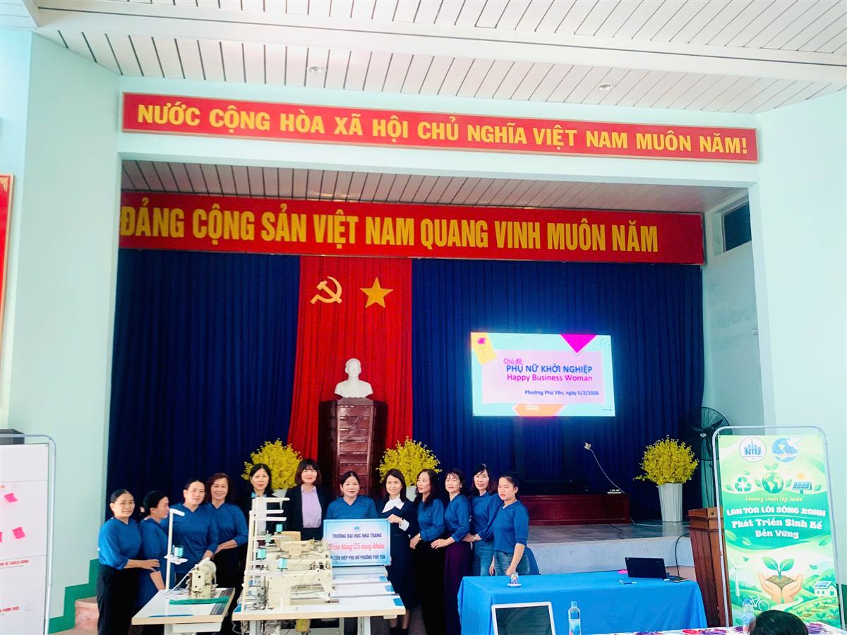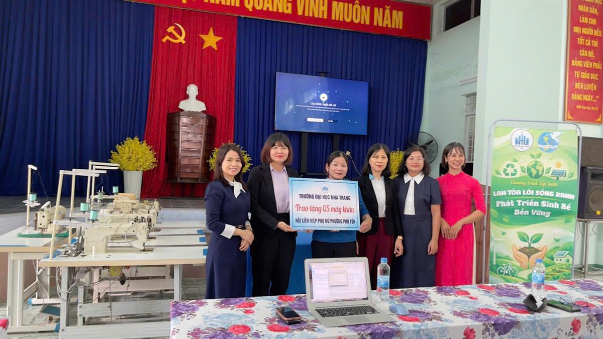 Ngày 05/02/2026, Trường Đại học Nha Trang phối hợp với Hội Liên hiệp Phụ nữ (LHPN) phường Phú Yên, Đắk Lắk tổ chức chương trình trao tặng 05 máy khâu nhằm hỗ trợ tổ phụ nữ tái chế lưới đánh cá khôi phục hoạt động sản xuất sau thiệt hại do bão lũ. Tham dự chương trình có bà Lê Thị Thuỳ Dâng - Chủ tịch Hội LHPN phường Phú Yên. Về phía Trường Đại học Nha Trang có TS. Trần Thị Mỹ Hạnh - Giám đốc Trung tâm Đổi mới sáng tạo; TS. Nguyễn Thị Ngân, Thư ký dự án REVFIN (Ngăn ngừa, hạn chế và tái chế rác thải ngư cụ gây ô nhiễm các vùng biển Việt Nam) và đoàn công tác.