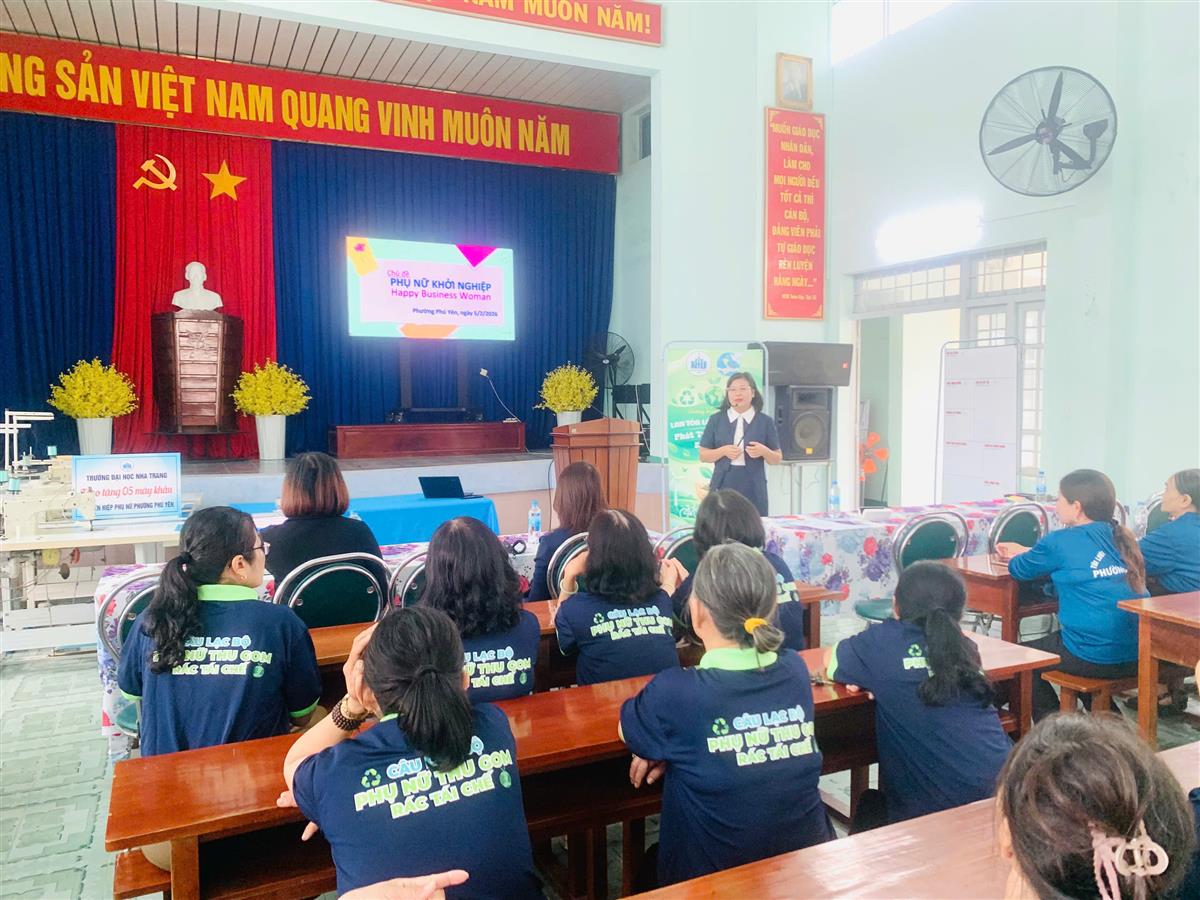 Cùng ngày, lớp tập huấn với chủ đề “Phụ nữ khởi nghiệp – sinh kế bền vững – giữ gìn môi trường”do ThS. Nguyễn Thị Dung trực tiếp hướng dẫn đã thu hút 50 hội viên phụ nữ tham gia. Nội dung tập huấn tập trung nâng cao nhận thức về khởi nghiệp đổi mới sáng tạo, định hướng phát triển sản phẩm và các giải pháp gia tăng giá trị cho mô hình tái chế lưới. Thông qua các hoạt động trao đổi thực tiễn và thảo luận nhóm, chương trình góp phần khơi dậy tinh thần chủ động, sáng tạo, giúp phụ nữ mạnh dạn phát triển kinh tế gắn với trách nhiệm bảo vệ môi trường.