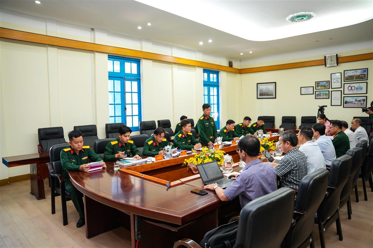 Đại diện Bộ CHQS tỉnh Khánh Hòa và lãnh đạo Trường Đại học Nha Trang trao đổi nội dung phối hợp tại buổi làm việc.