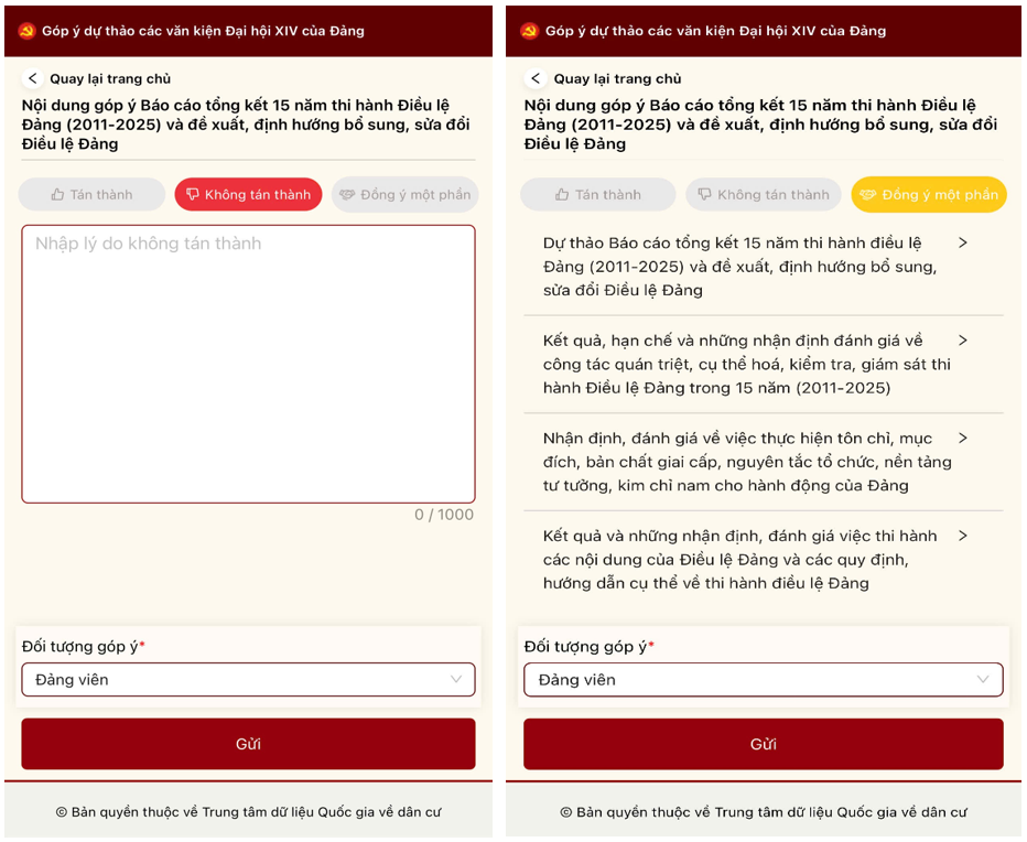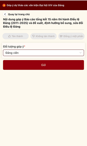 + Nhấn Tán thành nếu đồng ý với nội dung dự thảo văn kiện -> Chọn Đối tượng góp ý -> Nhấn Gửi