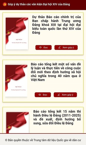 Bước 2: Tại màn Danh sách dự thảo các văn kiện Đại hội của Đảng, công dân nhấn Góp ý để thực hiện góp