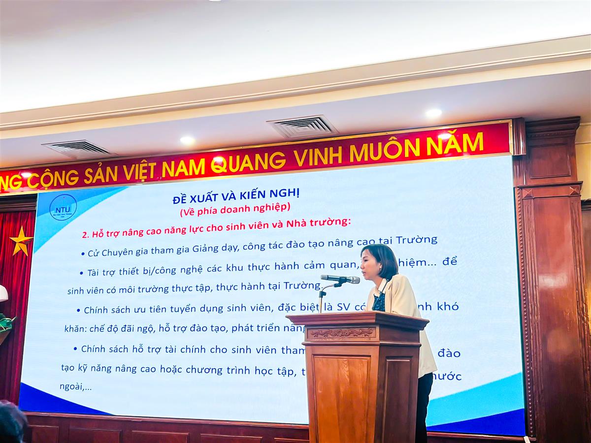 Tại Hội thảo, Trường Đại học Nha Trang trình bày báo cáo "Công tác hỗ trợ việc làm cho sinh viên của Trường Đại học Nha Trang", do ThS. Đặng Thị Phượng – chuyên viên Trung tâm Hỗ trợ Việc làm và Khởi nghiệp thực hiện, nêu bật các hoạt động kết nối doanh nghiệp, hỗ trợ thực tập và tư vấn nghề nghiệp trong thời gian qua.
