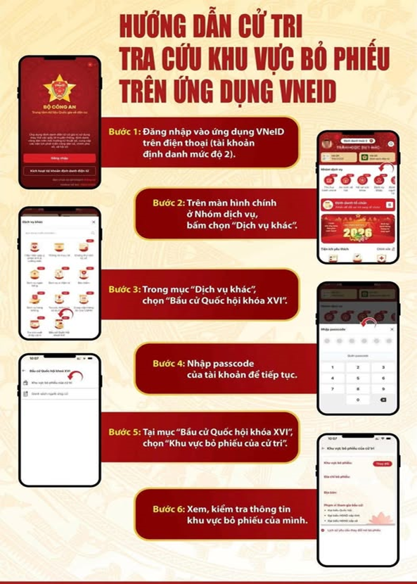 Nhằm giúp công dân trong việc tra cứu thông tin bầu cử, góp phần bảo đảm quyền và nghĩa vụ của cử tri trong Cuộc bầu cử đại biểu Quốc hội khóa XVI và đại biểu Hội đồng nhân dân các cấp nhiệm kỳ 2026–2031, Bộ Công an đã tích hợp chức năng tra cứu địa điểm khu vực bỏ phiếu trên ứng dụng VNeID.