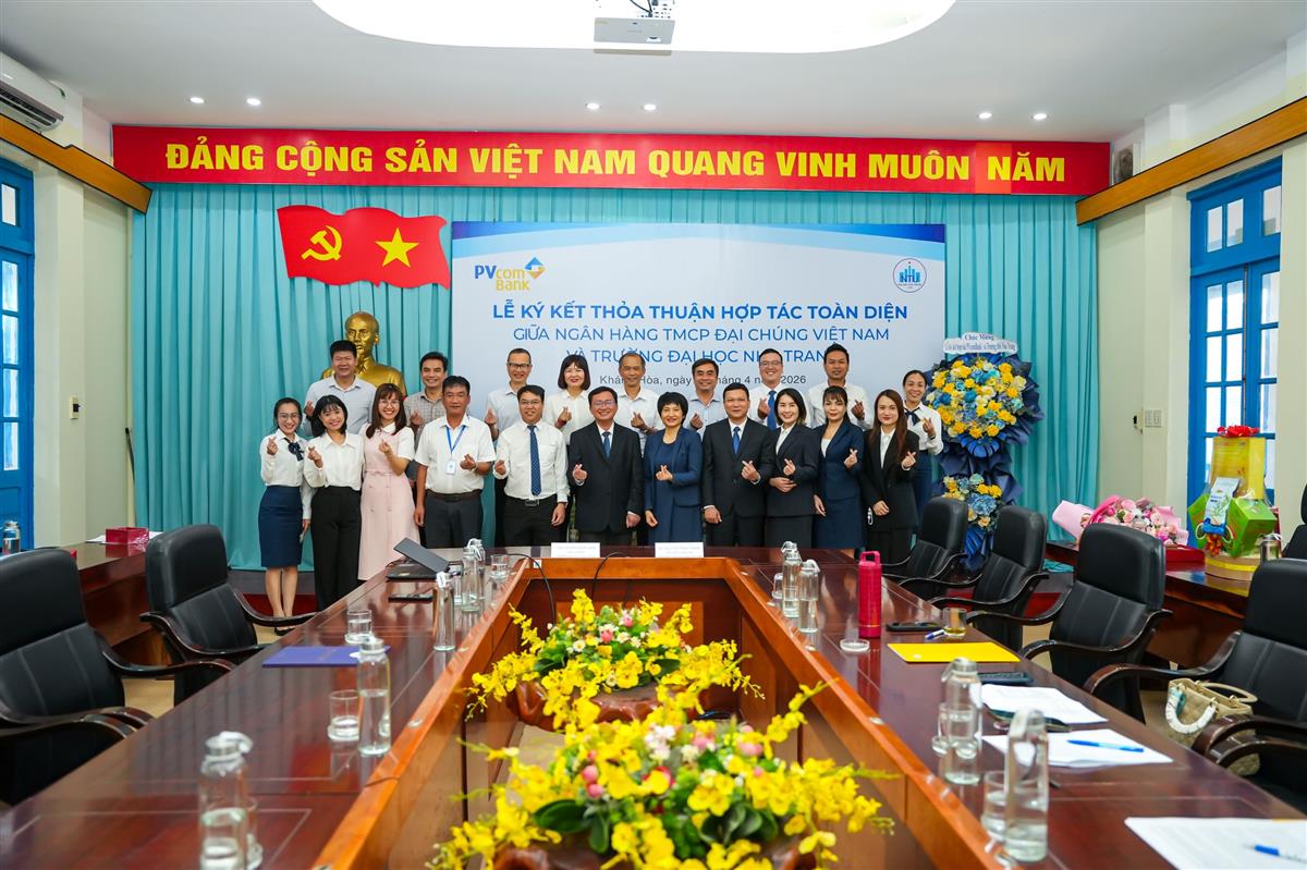 Ngày 23/4/2026, Trường Đại học Nha Trang tổ chức Lễ ký kết Thỏa thuận hợp tác toàn diện với Ngân hàng TMCP Đại Chúng Việt Nam (PVcomBank), đánh dấu bước phát triển mới trong mối quan hệ hợp tác giữa nhà trường và doanh nghiệp trong lĩnh vực tài chính – ngân hàng.