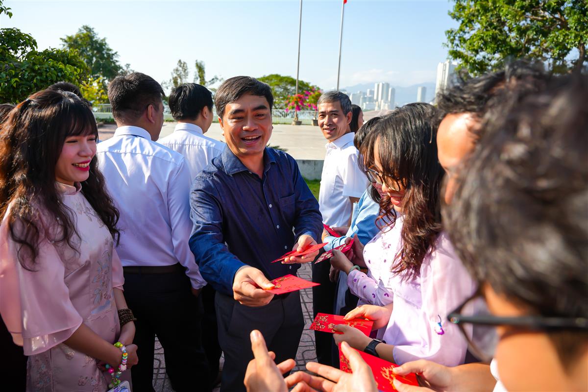 Trong không khí ấm áp đầu xuân, Ban Giám hiệu đã trao những phong bao lì xì may mắn đến cán bộ, viên chức, người lao động như một lời chúc cho một năm mới thuận lợi, hanh thông và nhiều thành công. Những nụ cười rạng rỡ, những cái bắt tay thân tình đã tạo nên bầu không khí phấn khởi, lan tỏa năng lượng tích cực trong ngày làm việc đầu năm.