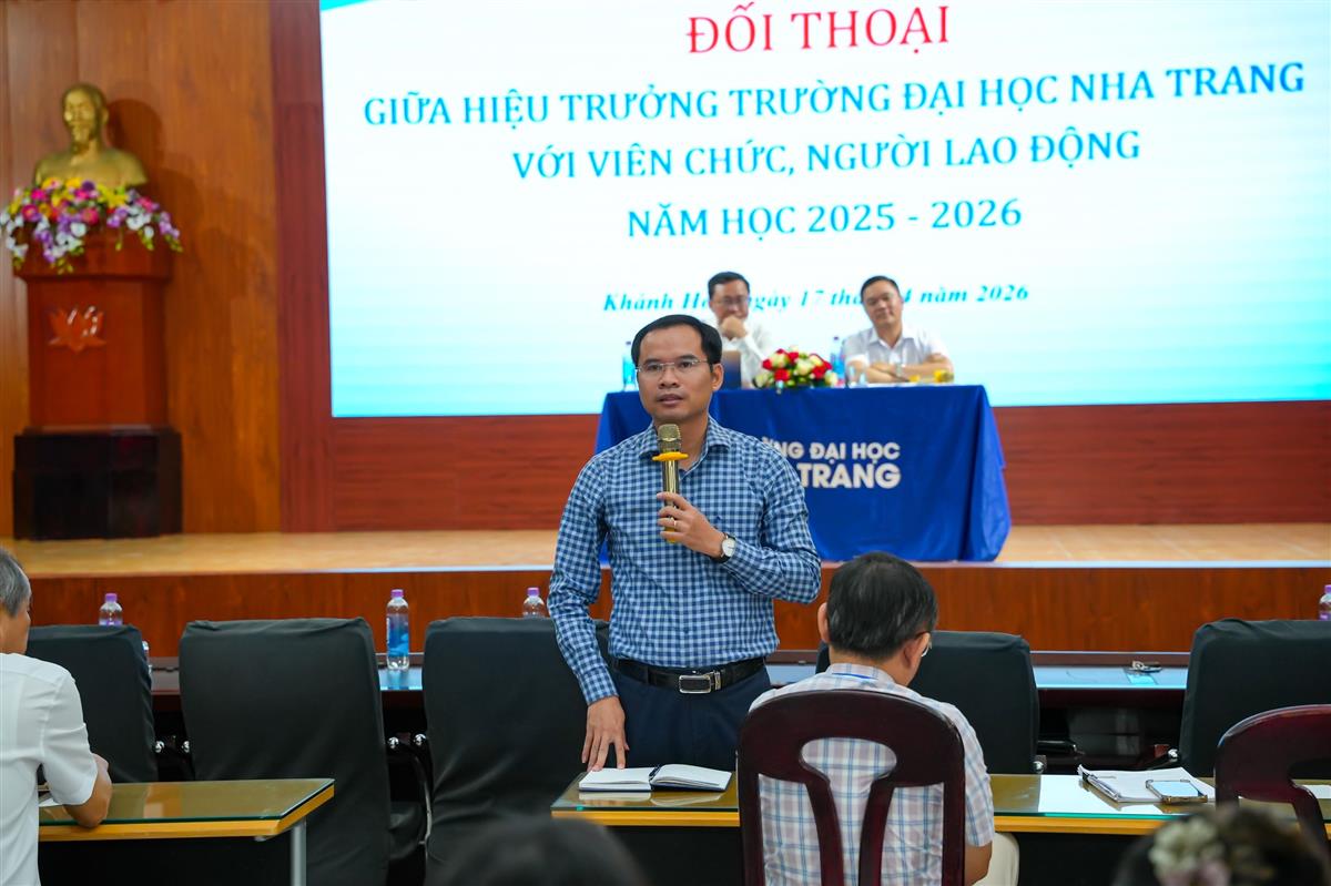 Viên chức, người lao động Trường Đại học Nha Trang tham gia đối thoại, thẳng thắn trao đổi ý kiến, kiến nghị với lãnh đạo Nhà trường.