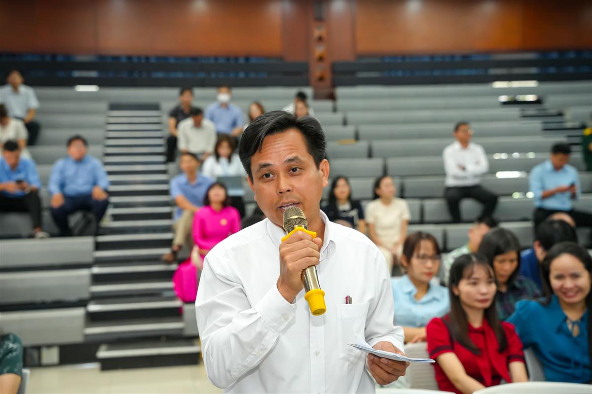 Ngay sau đó, phiên đối thoại giữa Hiệu trưởng và viên chức, người lao động diễn ra trong không khí thẳng thắn, cởi mở. Nhiều ý kiến được nêu ra xoay quanh điều kiện làm việc, cơ sở vật chất, chính sách hỗ trợ và định hướng phát triển của Nhà trường. Lãnh đạo Nhà trường đã trực tiếp giải đáp, ghi nhận và cam kết tiếp tục cải thiện môi trường làm việc, nâng cao chất lượng hoạt động chung.