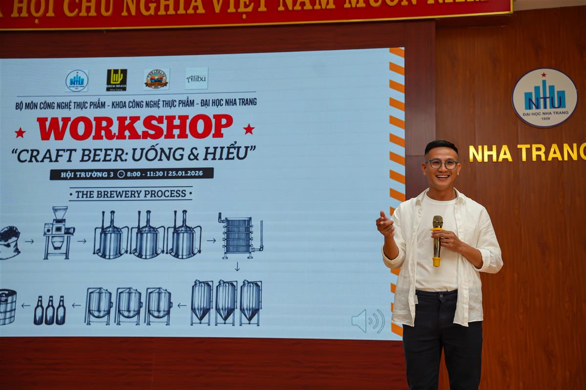 Ngày 25/01/2026, tại Hội trường 3, Trường Đại học Nha Trang tổ chức workshop chuyên đề “Uống và Hiểu”, nhằm trang bị kiến thức nền tảng về bia thủ công (craft beer), nâng cao hiểu biết chuyên môn và định hướng nghề nghiệp cho sinh viên, đặc biệt là sinh viên Khoa Công nghệ Thực phẩm và các lĩnh vực liên quan.